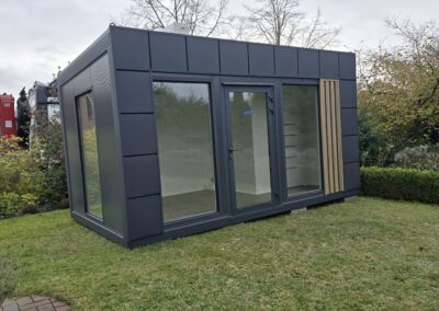 Der Pavillon besteht aus Sandwichelementen mit einem 100 mm dicken Schaumkern. Feuerhemmender Polystyrolschaum mit Feuerwiderstandsklasse E60 – Anthrazit (Graphit) RAL 7016 -. Das Polystyrol verbreitet kein Feuer mit der Feuerwiderstandsklasse E60: Außenfarbe RAL zu bestimmen.