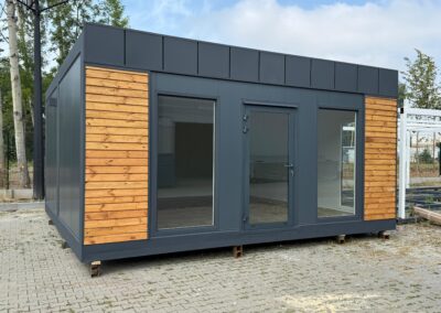 Der Pavillon besteht aus Sandwichelementen mit einem 100 mm dicken Schaumkern. Feuerhemmendes Polystyrolschaum mit Feuerwiderstandsklasse E60 – RAL 7016 Anthrazit (Graphit) – Styropor nicht brandausbreitend mit Feuerwiderstandsklasse E60: RAL-Außenfarbe zu bestimmen.